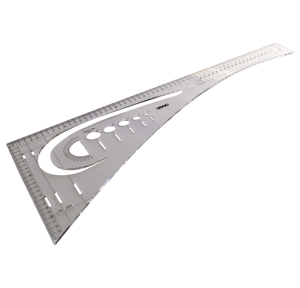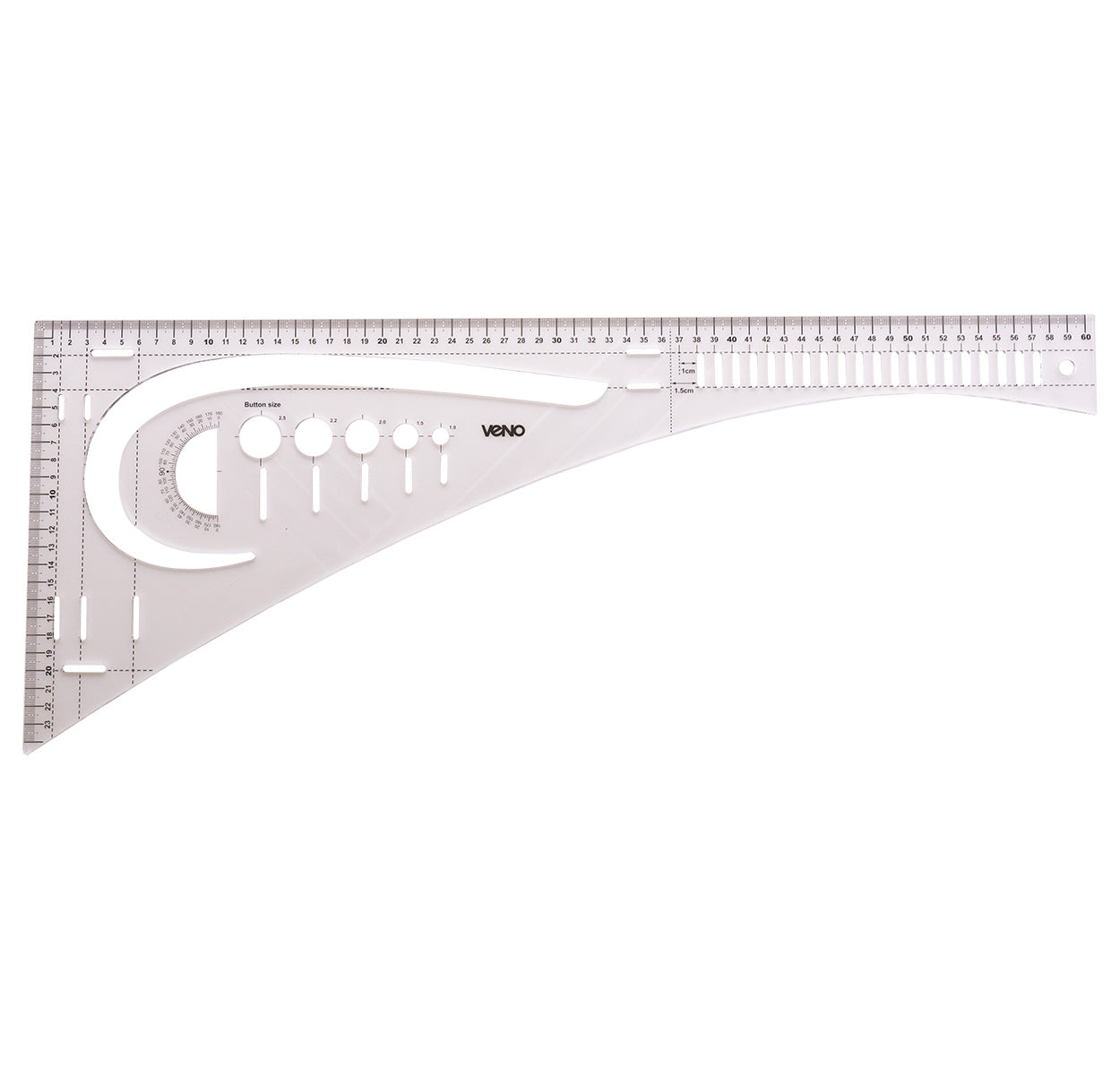 An den geraden Außenkanten des transparenten Kunststofflineals findet man eine 60 cm‑und eine 24 cm‑Skala mit einer gut ablesbaren Gliederung. Auch Knopflochgrößen können ermittelt und sofort präzise angezeichnet werden.